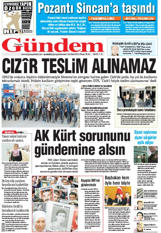 Özgür Gündem’in matbaasına baskın yapılarak toplatılan 25 Mart 2012 tarihli sayısının ilk sayfasını aşağıda yayınlıyoruz. Gazete toplatılmasaydı ‘Cizîr teslim alınamaz’ manşetiyle çıkacaktı.
