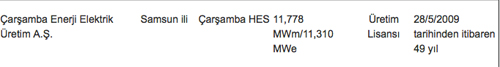 Enerji Piyasası Düzenleme Kurulu’nun 7/5/2009, 12/5/2009, 20/5/2009 ve 28/5/2009 tarihli Kararlarıyla Metro Turizm sahibi Galip Öztürk ile Bakan Suat Kılıç’ın ortak olduğu Çarşamba Elektrik Üretim A.Ş’ye vermiş olduğu lisans: