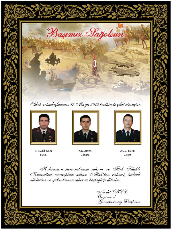 ”Başımız sağolsun” başlığının kullanıldığı mesajda, Orgeneral Özel, şunlar kaydetti: ”Silah arkadaşlarımız 17 Mayıs 2012 tarihinde şehit olmuştur. Kahraman personelimize şahsım ve Türk Silahlı Kuvvetleri mensupları adına Allah’tan rahmet, kederli ailelerine ve yakınlarına, sabır ve başsağlığı dilerim.”