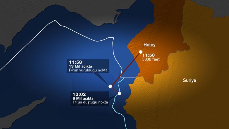 11:58 : Uçak füze sistemiyle vuruluyor, uluslararası sularda vuruluyor. Kontrolünü kaybeden uçak Suriye kara sularına düşüyor.