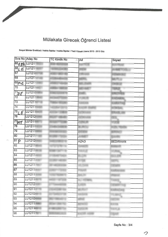 Haberin yankıları sürerken ortaya bir belge çıktı. “Sosyal Bilimler Enstitüsü / Halkla İlişkiler / Tezli Yüksek Lisans 2012-2013 Mülakata Girecek Öğrenci Listesi”nde bazı öğrencilerin başlarında kısaltma notlar alınarak fişlendiği görüldü. Kısaltmaların çoğunun fakültede eğitim veren hocaların isim ve soyadlarından oluştuğu ve o öğrencilerin bu hocalara yakın olduğunun vurgulandığı belirtiliyor. Bazı öğrenciler için de “P” kısaltması kullanılmış. P, kısaltmasının ” PKK ” anlamına geldiği ve bu öğrencilerin “terörist” olarak fişlendiği görülüyor. Bu sene Halkla İlişkiler Yüksek Lisans programına başvuran, ancak fişlendiği için kabul edilmediği belirtilen öğrencilerden Azad Bedirhan da listede adı P’yle fişlenen öğrenciler arasında yer alıyor.