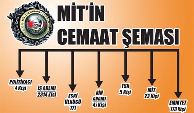 Başbakan Tayyip Erdoğan’ın talimatıyla MİT tarafından hazırlanan “Fethullah Gülen Cemaati” raporunda cemaatin para kaynakları, destek veren şirketler, şirket yöneticileri ve eğitim kurumları takibe alındı. Raporda şöyle denildi: “Eldeki bilgi ve belgeler ışığında, kayıt içi olmakla birlikte, kontrol dışı kalan cemaat şirketleri, kuruluşları hakkında izleme ve inceleme başlatılmıştır.” MİT raporunda, şirketlerin Gülen’in icazetiyle kurulduğunu saptıyor!
