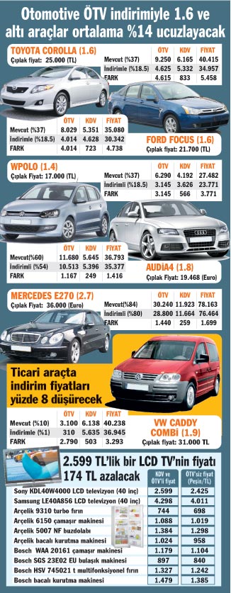 Başbakan Recep Tayyip Erdoğan’ın önceki gün açıkladığı krize karşı vergi indirimleriyle ilgili önlem paketi, dün tamamlandı. Maliye Bakanlığı’nın yoğun gece mesaisiyle otomotiv ve beyazeşyada yapılacak ÖTV indirimleri ile diğer önlemlerin oranları belirlendi. Maliye Bakanlığı üst yönetimi, paketi Başbakanlığa gönderdi. 1.6 CC ve altı araçlarda 5 bin TL’ye varan indirim getirecek paketin yürürlüğe girmesi için gerekli Bakanlar Kurulu kararı dün imzaya açıldı. Paketin Pazartesi ya da Salı günü Resmi Gazete’de yayımlanarak yürürlüğe girmesi hedefleniyor. Paketin son hali şöyle: