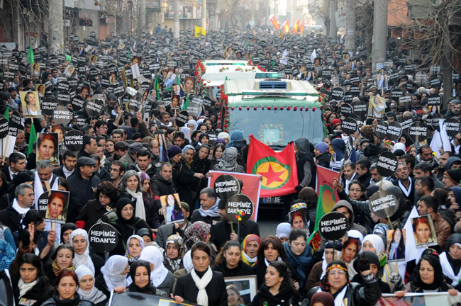 Paris’te suikast sonucu öldürülen üç PKK’lının cenazeleri Salı günü İstanbul’a getirildi. Biri Tunceli, biri Kahramanmaraş diğeri Mersin’de defnedilecek olan cenazeler için Diyarbakır’da miting gibi bir cenaze töreni düzenlendi.