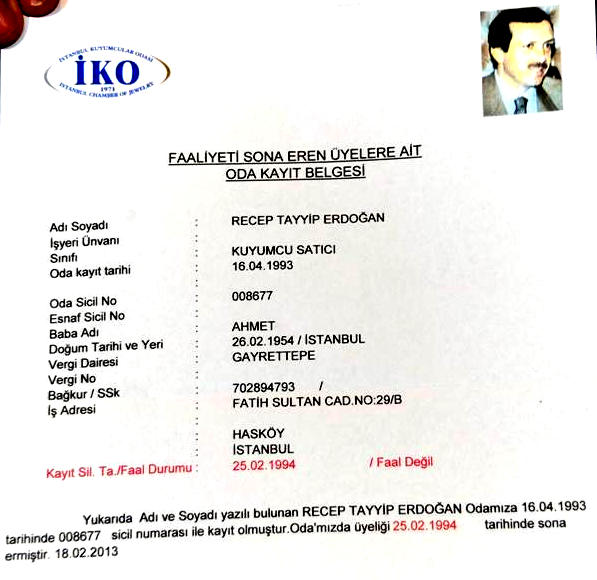 Ankara’da düzenlenen bir toplantya katılan, İKO Başkanı Alaattin Kameroğlu, Başbakan Erdoğan’ın 16 Nisan 1993 ile 25 Şubat 1994 tarihleri arasında ‘’Kuyumcu-Satıcı’’ olduğunu açıkladı. 068677 sicil kayıt numarası ile Erdoğan’a verilen ruhsatı da gösterdi. Erdoğan o dönemde iş adresini de ‘’Fatih Sultan Caddesi No: 29/B Hasköy-İstanbul’’ olarak bildirdi. Erdoğan aktif üyelikten ayrıldıktan bir ay sonra 27 Mart 1994’de İstanbul Büyükşehir Belediye Başkanı seçildi.