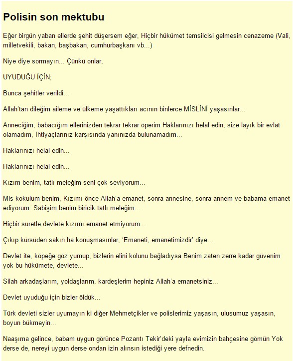 Mardin’de PKK’liler 4 polisi şehit etti. Şehit polisin cebinden çıkan vasiyetnamede “Devlete kızımı emanet etmiyorum. Cenazeme devlet yetkilisi gelmesin..” yazıyordu.