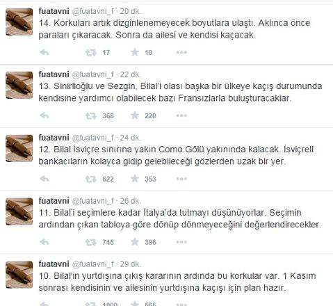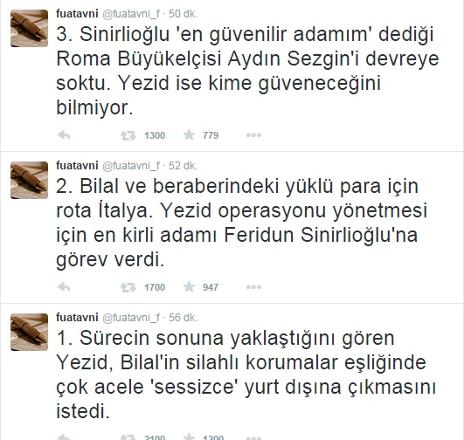Hükümet ve Cumhurbaşkanı Erdoğan hakkında yazdıklarıyla gündeme gelen Fuat Avni, Önce paraların kaçırılacağını, sonrasında Erdoğan ile birlikte ailesinin de yurt dışına kaçağını öne sürmüştü. Fuat Avni dün de Bilal Erdoğan’ın seçimlere kadar yurt dışında kalacağını takipçileriyle paylaşmıştı.