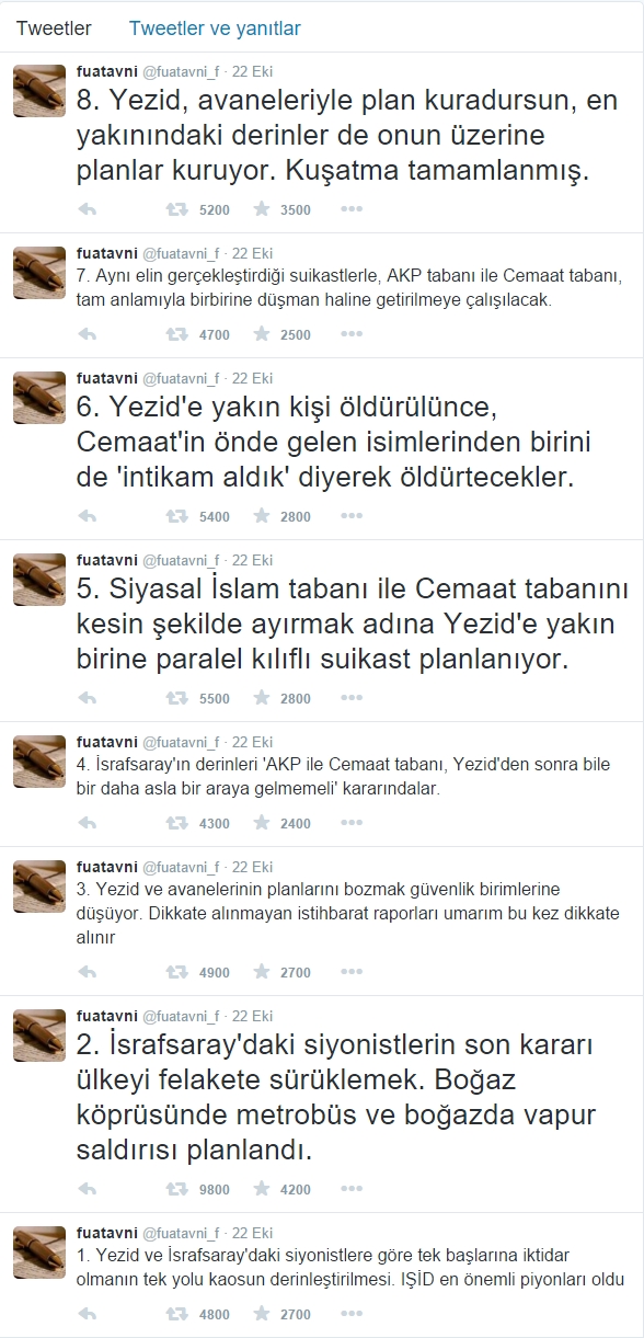 “Y… ve İsrafsaray’daki siyonistlere göre tek başlarına iktidar olmanın tek yolu kaosun derinleştirilmesi. IŞİD en önemli piyonları oldu. İsrafsaray’daki siyonistlerin son kararı ülkeyi felakete sürüklemek. Boğaz köprüsünde metrobüs ve boğazda vapur saldırısı planlandı. Y… ve avanelerinin planlarını bozmak güvenlik birimlerine düşüyor. Dikkate alınmayan istihbarat raporları umarım bu kez dikkate alınır. İsrafsaray’ın derinleri ‘AKP ile Cemaat tabanı, Yezid’den sonra bile bir daha asla bir araya gelmemeli’ kararındalar. Siyasal İslam tabanı ile Cemaat tabanını kesin şekilde ayırmak adına Y…’ye yakın birine paralel kılıflı suikast planlanıyor. Y…’ye yakın kişi öldürülünce, Cemaat’in önde gelen isimlerinden birini de ‘intikam aldık’ diyerek öldürtecekler. Aynı elin gerçekleştirdiği suikastlerle, AKP tabanı ile Cemaat tabanı, tam anlamıyla birbirine düşman haline getirilmeye çalışılacak. Yezid, avaneleriyle plan kuradursun, en yakınındaki derinler de onun üzerine planlar kuruyor. Kuşatma tamamlanmış.”