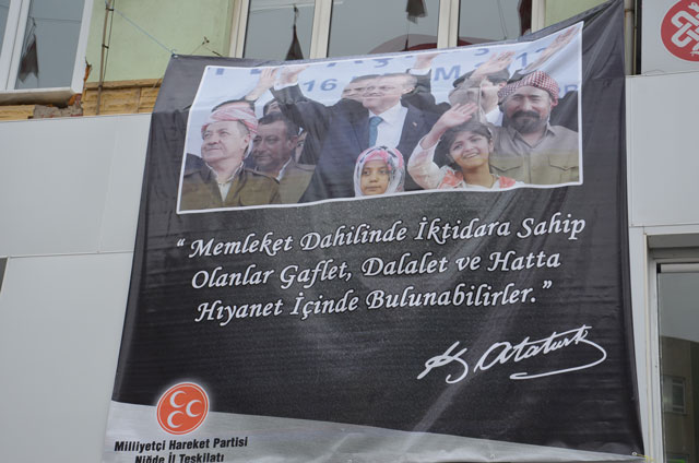 MHP Niğde İl Başkanlığı binası önüne asılan pankarttaki fotoğrafta Diyarbakır’da bir törende dönemin Başbakanı olan Recep Tayyip Erdoğan’ın Diyarbakır’da toplu açılış töreninde Irak Kürt Bölgesel Yönetim Başkanı Mesut Barzani, Kürt asıllı sanatçı Şivan Perver’in peşmerge kıyafetleri ile yapılan açılış töreninde kurdele kesimi fotoğrafı yer alıyor. Fotoğrafın altına ise Mustafa Kemal Atatürk’ün Gençliğe Hitabesinde yer alan ‘Memleket dahilinde iktidara sahip olanlar, gaflet, dalalet ve hatta hıyanet içinde bulunabilirler” şeklinde yazı yazıldı.