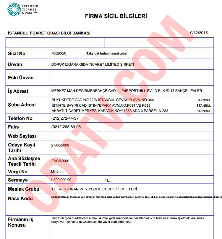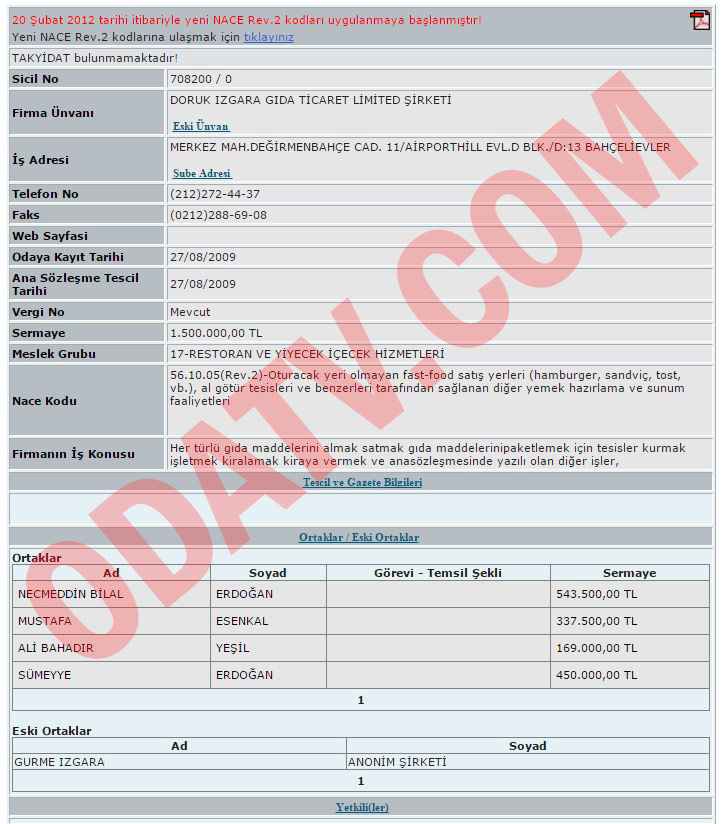 Odatv, Bilal Erdoğan’ın restoranlarını İstanbul Ticaret Odası (İTO) kayıtlarından araştırdı. İTO kayıtlarına göre, Bilal Erdoğan’ın restoran yatırımları yaptığı şirketi Doruk Izgara. Şirket, “Gülhane Döner” markasıyla Cevahir AVM, İstinye Park AVM, Akbatı AVM, Akasya AVM ve Zorlu Center’da faaliyet gösteriyor.