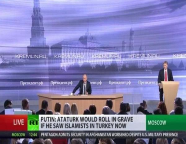 Rusya Devlet Başkanı Vladimir Putin’in geleneksel yılsonu basın toplantısı başladı. Putin, Türkiye ile ilgili yine sert açıklamalar yaptı. “Türk yönetiminin İslamlaştırma politikası yüzünden Atatürk herhalde mezarında ters dönmüştür” dedi.