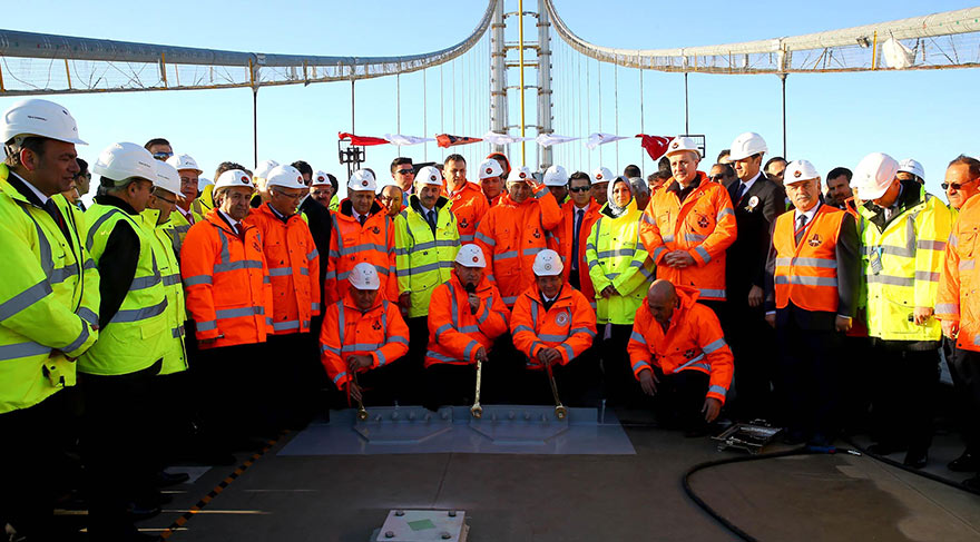 Cumhurbaşkanı Recep Tayyip Erdoğan, Başbakan Ahmet Davutoğlu ve Ulaştırma Denizcilik ve Haberleşme Bakanı Binali Yıldırım, İzmit Körfez Geçişi Köprüsü’nün son tabliyesinin vidalarını sıkarak körfezin iki yakasının birleşmesini sağladı. Bin 550 metre orta açıklığı ile dünyanın en büyük orta açıklığa sahip 4′üncü asma köprüsü olan, 2 bin 682 metre uzunluğundaki İzmit Körfez Geçişi Köprüsü, Mayıs ayı sonunda ulaşıma açılacak. Cumhurbaşkanı Erdoğan köprünün adını “Osman Gazi Köprüsü” olarak açıkladı.