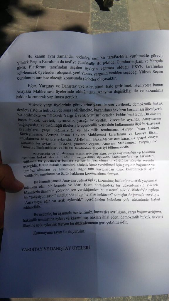 Yargıtay ve Danıştay üyeliklerinin yasa ile düşürülmesi ve yüksek yargının tasfiyesi ile ilgili yargıçlar sessizliğini bozdu. Yargıtay üyeleri yaptıkları açıklamada, “Demokratik hukuk devletine aykırı bu yasa geri çekilmelidir” dedi.