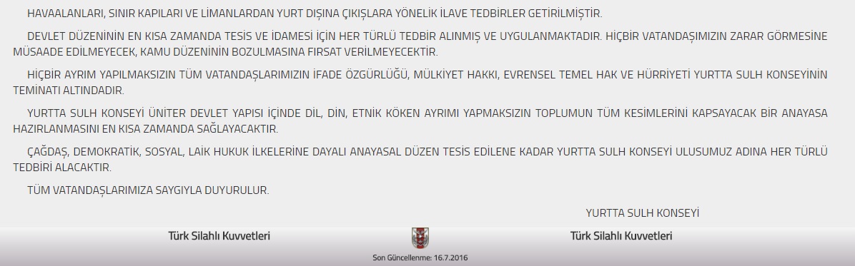 Anayasa Mahkemesi (AYM) Twitter adresinden yaptığı açıklamada, “Anayasal düzene karşı her türlü demokrasi dışı girişimi reddediyoruz. Demokratik hukuk devletinin yanında olduğumuzun aziz milletimizce bilinmesini istiyoruz. Kamuoyuna saygı ile duyurulur”ifadelerini kullandı.