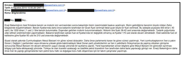 Aynı şahıs, e-postanın devamında Kürdistan Bölgesel Yönetimi’nde Barzani’nin başkanlık görevine devam etmemesi durumunda işlerin bozulacağınıysa şu sözlerle özetliyor: “Siyasi olarak yakında Cumhurbaşkanı Mesut Barzani’nin görev süresi dolacaktır. Daha önce parlemento kararı ile görev süresi uzatılmıştı. Yeni cumhurbaşkanının İran a yakın Goran (Değişim) partisinden veya olmasına yüksek gözle bakılmaktaydı fakat Goran parti yöneticilerinin ve İranlı yetkililerin Süleymaniye’de yapmış oldukları görüşme sonucunda Mesut Barzani nin devam etmesinin uygun olacağı yönünde bir açıklama yapıldı. Yerel kaynaklardan alınan bilgilere göre Mesut Barzani nin görevden ayrılması bölgeyi çok fazla etkileyeceği yönünde. Türkiye ile olan ticaretin azalacağı ve özellikle petrol ticaretinin İran tarafından daha fazla yapılacağı görüşü var.”