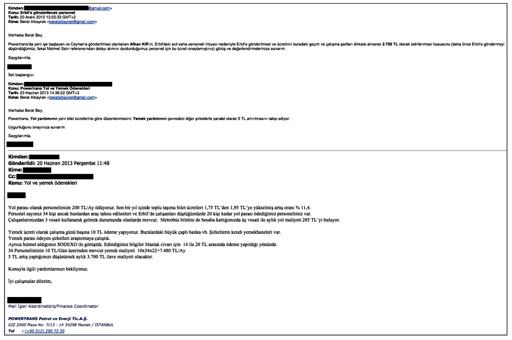 RedHack’in sızdırdığı maillere göre Kürdistan Bölgesel Yönetimi petrollerini taşıyan Powertrans adlı şirkette Enerji ve Tabii Kaynaklar Bakanı Berat Albayrak ‘söz sahibi;’ öyle ki işe alınacak personelden işçilerin günlük yemek giderine kadar her şey kendisinin onayına sunuluyor.