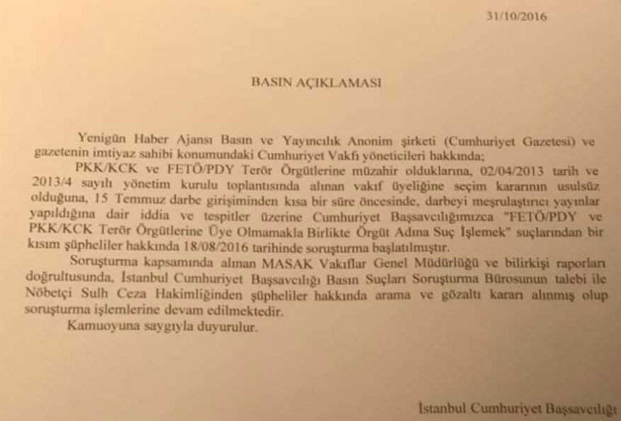 İstanbul Cumhuriyet Başsavcılığı, operasyona ilişkin olarak, “FETÖ ve PKK terör örgütlerine üye olmamakla beraber örgüt adına faaliyetle bulunmak suçlarından soruşturma başlatılmıştır” açıklaması yaptı. Öte yandan Cumhuriyet gazetesine yönelik başlatılan “FETÖ/PDY ve KCK/PKK” soruşturmasına gizlilik getirildi. Karar dünün, 30 Ekim 2016’nın tarihini taşıyor.