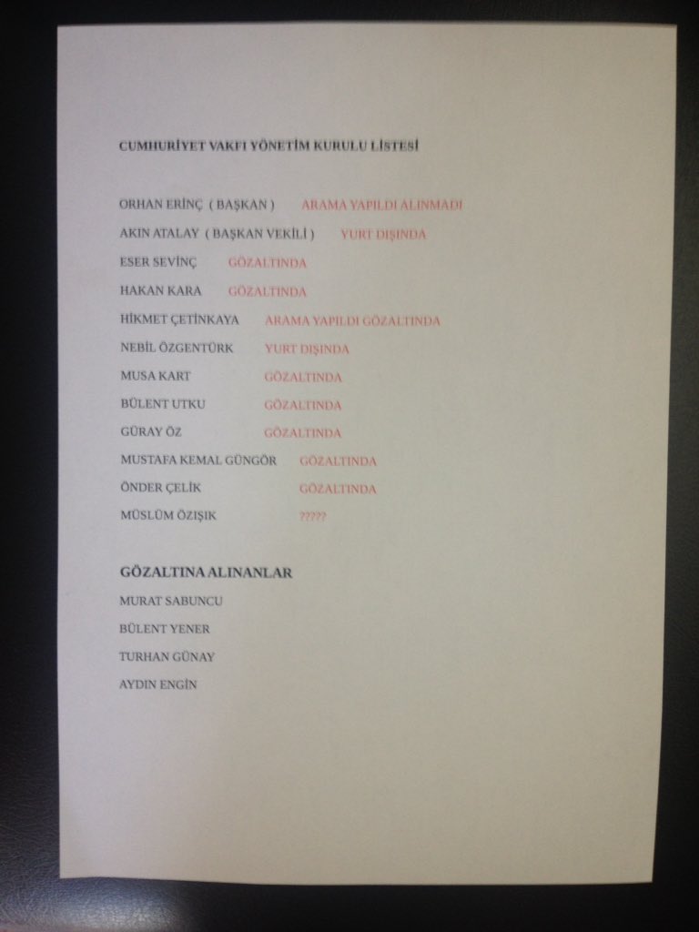 İstanbul Cumhuriyet Başsavcılığı’nca verilen gözaltı, Nöbetçi Sulh Ceza Hakimliği’nce alınan “suç delillerine ilişkin arama ve el koyma kararı” kararı uyarınca Cumhuriyet Gazetesi’nin sahibi konumundaki Cumhuriyet Vakfı’nın Yönetim Kurulu üyeleri Akın Atalay, Musa Kart ve Mustafa Kemal Güngör‘ün evlerinde de İstanbul Emniyet Müdürlüğü Terörle Mücadele Şubesi ekiplerincearama yapıldı.