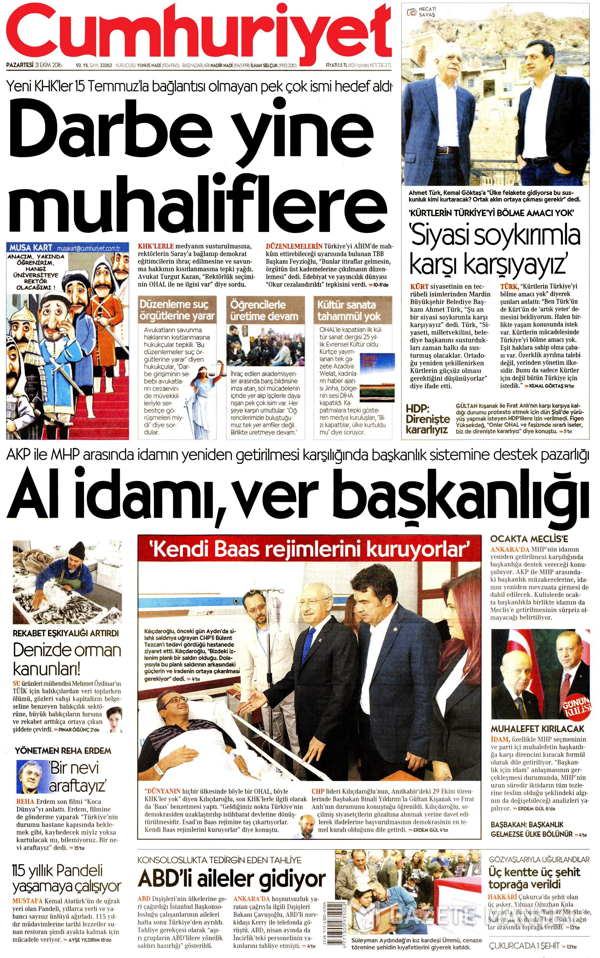 Adını Atatürk’ün koyduğu Türkiye’nin en eski ulusal gazetesi olan Cumhuriyet’in yöneticileri ve yazarlarına yönelik olarak sabah saatlerinde operasyon başlatıldı. Gazetenin Genel Yayın Yönetmeni Murat Sabuncu İstanbul’da, Okur Temsilcisi Güray ÖzAnkara’da gözaltına alındı. Gazetenin yazar ve yönetici kadrosundan 18 isim hakkında gözaltı kararı bulunduğu bildirilirken, Aydın Engin ve Kadri Gürsel de evinde arama yapıldıktan sonra gözaltına alındı. Öte yandan Cumhuriyet’e destek vermek için gazeteciler ve okurlar, bina önünde toplanmaya devam ediyor. Binanın önüne Çevik Kuvvet ekipleri ve TOMA gitti.
