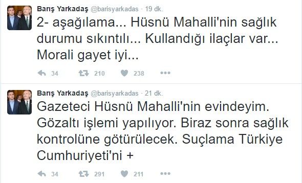 Yarkadaş,”Gazeteci Hüsnü Mahalli’nin evindeyim. Gözaltı işlemi yapılıyor. Biraz sonra sağlık kontrolüne götürülecek. Suçlama Türkiye Cumhuriyeti’ni aşağılama… Hüsnü Mahalli’nin sağlık durumu sıkıntılı… Kullandığı ilaçlar var… Morali gayet iyi…” dedi.