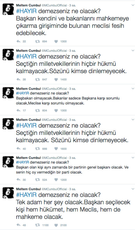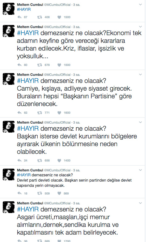Kişisel Twitter hesabından “Hayır demezseniz ne olacak?” sorusu altında paylaşımlarda bulunan Cumbul, “sistem değişikliğinin olması halinde ekonominin tek adamın keyfine göre vereceği kararlara kurban edileceğini, kriz, iflaslar, işsizlik ve yoksulluğun geleceğini” öne sürdü.