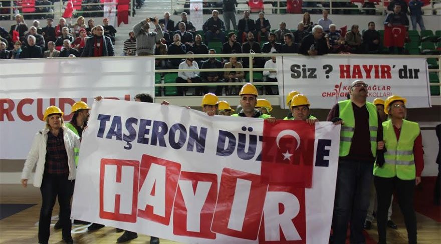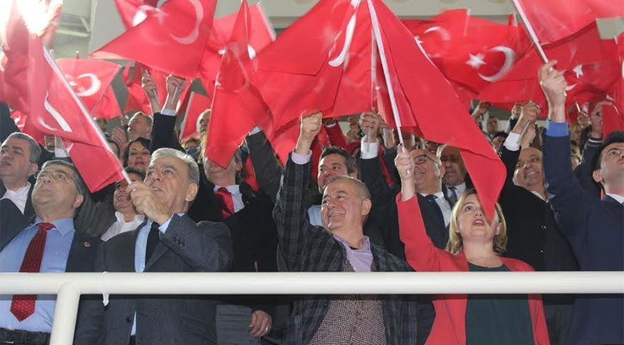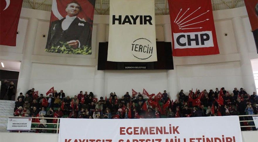 CHP İzmir İl Örgütü Bornova Atatürk Spor Kompleksi’nde yapılan toplantıda buluştu. Tamamen dolan spor salonunda Atatürk posterleri ve Türk bayrakları ile “Hayır” yazılı afişler, “Egemenlik kayıtsız şartsız milletindir” ve “Cumhuriyete sahip çıkmak boynumuzun borcudur” yazılı pankartlar yer aldı. Toplantı öncesi ve sonrasında İzmir Marşı ve Barış Manço’nun ‘Hayır’ şarkısı çalındı. Salona kurulan ekrana “İzmir neden hayır diyor” başlıklı video izlettirildi. CHP’liler “Mustafa Kemal’in askerleriyiz”, “Türkiye laiktir, laik kalacak” sloganları attı.