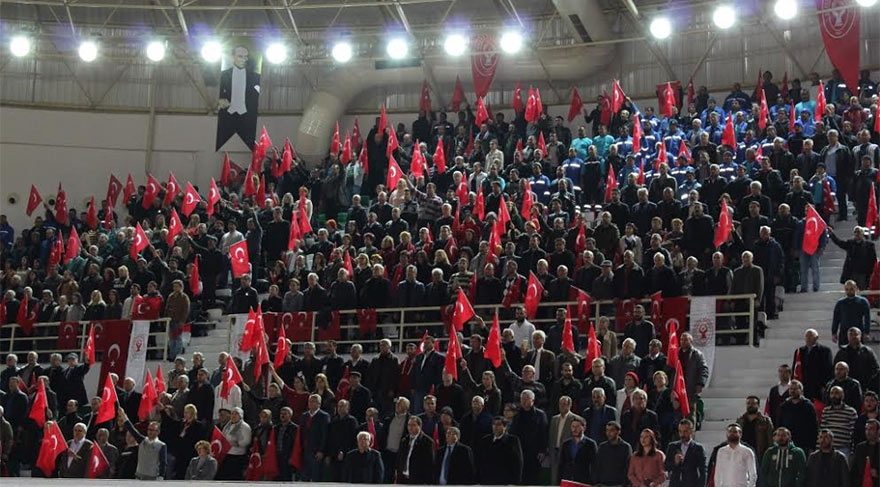 İzmir Milletvekili Tacettin Bayır, salona seslenerek, “94 yıl önce yedi düvele baş kaldıran Mustafa Kemal Atatürk ve silah arkadaşları bize bu cumhuriyeti emaneten bıraktılar. Bu Cumhuriyeti yıktırmaya müsaade edecek misiniz? O boyu uzun, dili uzun, eli uzun adamın halife olmasına izin verecek misiniz” diye sordu. Topluluk “Hayır” diye karşılık verdi. Bayır, “Bu seçim normal bir seçim değil. Bu seçimin telafisi yoktur. Ya cumhuriyetten vazgeçip çoluk çocuğu örümcek kafalıların kucağına atacaksınız ya da Atatürk’ün yolundan yürüyeceksiniz” ifadelerini dile getirdi.