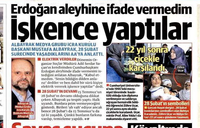 Mustafa Albayrak, 15 Temmuz darbe girişiminin 28 Şubat’ın devamı olduğunu savunan Mustafa Albayrak, dönemin Organize Suçlar Şube Müdürü Adil Serdar Saçan tarafından kendilerine işkence yapıldığını ileri sürdü. Albayrak, şunları söyledi “2001’de içeri aldılar. O dönem 6 ay cezaevinde yattım. O zaman yeni kurulmuş olan AK Parti ve şimdiki Sayın Cumhurbaşkanı Tayyip Erdoğan aleyhine ifade vermemi istediler. Kabul etmedim. ‘O zaman senin bildiğin dilden anlarız’ dediler ve ben dahil bir sürü kişiye elektrik verme suretiyle işkence yaptılar”