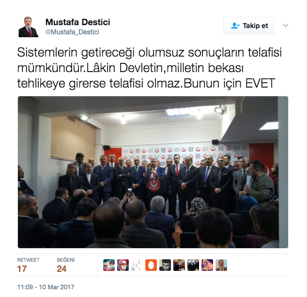 Destici, sosyal medya hesabında “Sistemlerin getireceği olumsuz sonuçların telafisi mümkündür. Lâkin Devletin,milletin bekası tehlikeye girerse telafisi olmaz. Bunun için ‘evet” paylaşımını yaptı.