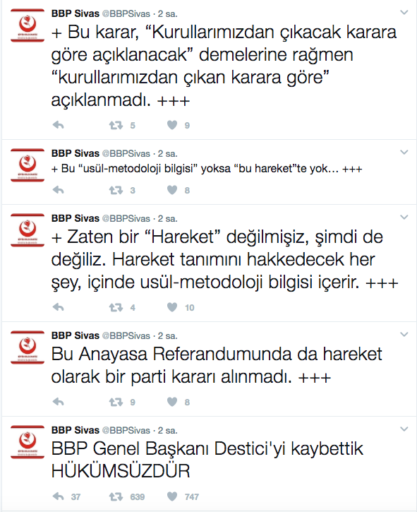 Büyük Birlik Partisi (BBP) Sivas İl Başkanlığı’nın sosyal medya hesabında, Genel Başkan Mustafa Destici‘nin 16 Nisan’da yapılacak anayasa değişikliği referandumunda ‘evet’ oyu kullanacaklarına yönelik açıklamasına tepki gösterildi. İl başkanlığından yapılan açıklamada “BBP Genel Başkanı Destici’yi kaybettik. Hükümsüzdür” dendi.
