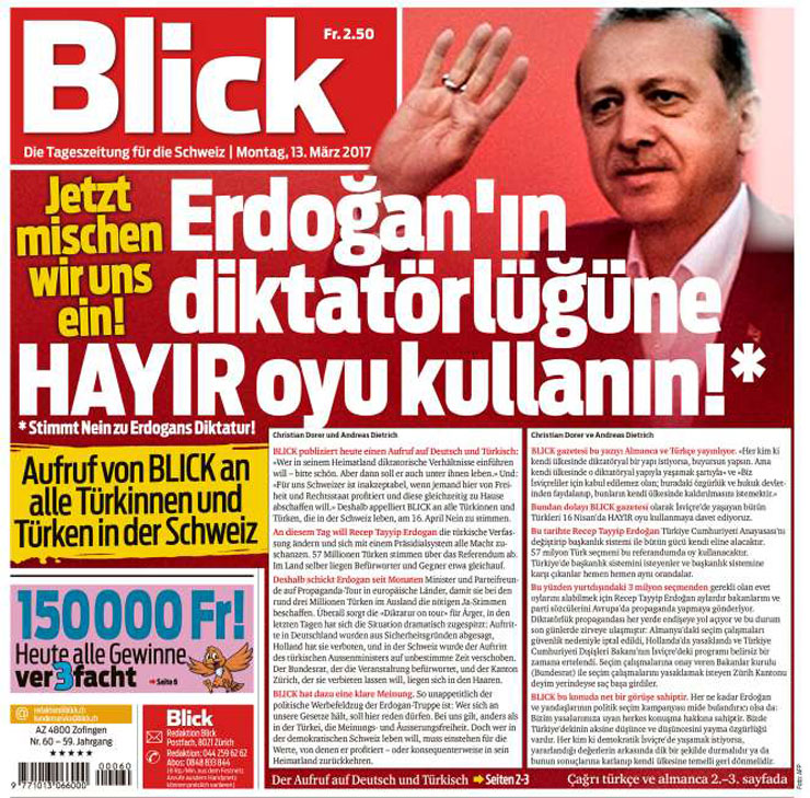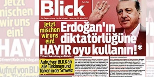 İsviçre’de yayımlanan Blick gazetesi, Türkiye’de 16 Nisan’da halk oylamasına sunulacak ve partili cumhurbaşkanlığı sistemini öngören anayasa değişikliğini, birinci sayfasına Türkçe manşetle taşıdı. “Erdoğan’ın diktatörlüğüne ‘Hayır’ oyu kullanın” başlığıyla yayımlanan haberde, “Biz İsviçreliler için kabul edilemez olan; buradaki özgürlük ve hukuk devletinden faydalanıp, bunların kendi ülkesinde kaldırılmasını istemektir. Bu kabul edilemez” ifadesine de yer verildi.