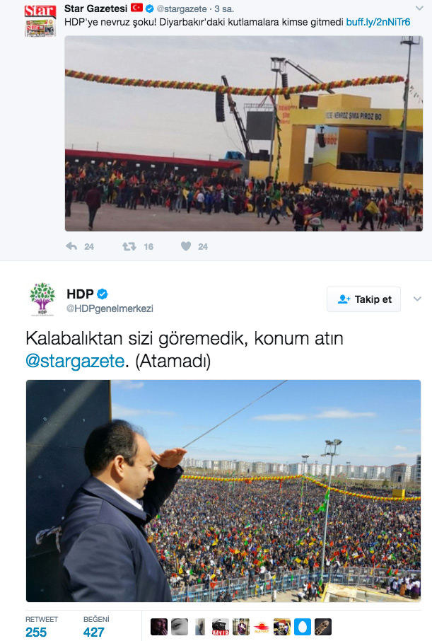 HDP’nin resmi Twitter hesabından, Newroz alanından parti sözcüsü Osman Baydemir‘in kalabalığı seyrettiği bir fotoğraf paylaşıldı. Akşam ve Star’ın ilgili haberlerinin tweetleri mentionlanarak, “Kalabalıktan sizi göremedik, konum atın. (Atamadı)” tweeti ile gönderme yapıldı.