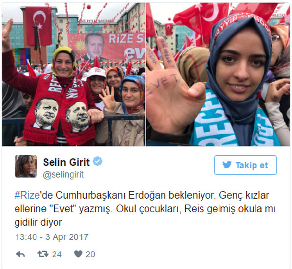 BBC Türkçe’den Selin Girit, Erdoğan’ın Rize’ye gelişi öncesi, miting alanından paylaşım yaptı. Girit, kişisel Twitter hesabından yaptığı paylaşımda yer alan öğrencilerin “Reis gelmiş okula mı gidilir” dediğini yazdı.