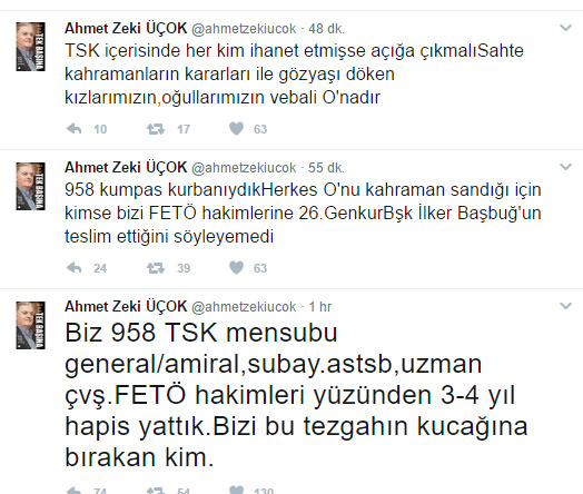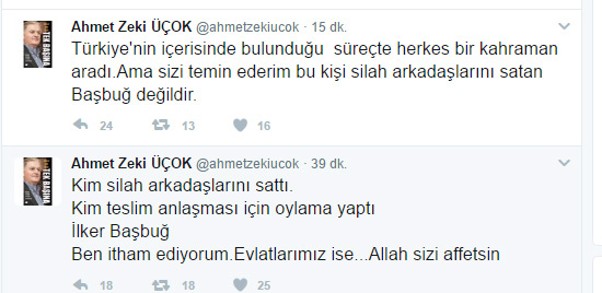 Twitter hesabından açıklama yapan Üçok, İlker Başbuğ‘u silah arkadaşlarını satmakla suçladı ve şunları yazdı.