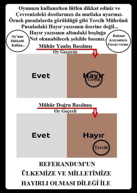 “Son günlerde özellikle sosyal medyada seçmenlerin halkoylamasında ‘TERCİH’ mührünü oy pusulasında ‘EVET’ veya ‘HAYIR’ yazılarının üzerine basmamaları gerektiği, yoksa oyların geçersiz sayılacağı yönünde asılsız ve yanlış haberler dolaşmaktadır. Birleşik oy pusulasında ‘EVET’ için beyaz, ‘HAYIR’ için kahverengi bölümler ayrılmıştır. ‘TERCİH’ mührünün bu bölümlerden sadece birine (yazının üstüne de denk gelse) basılması yeterlidir.”