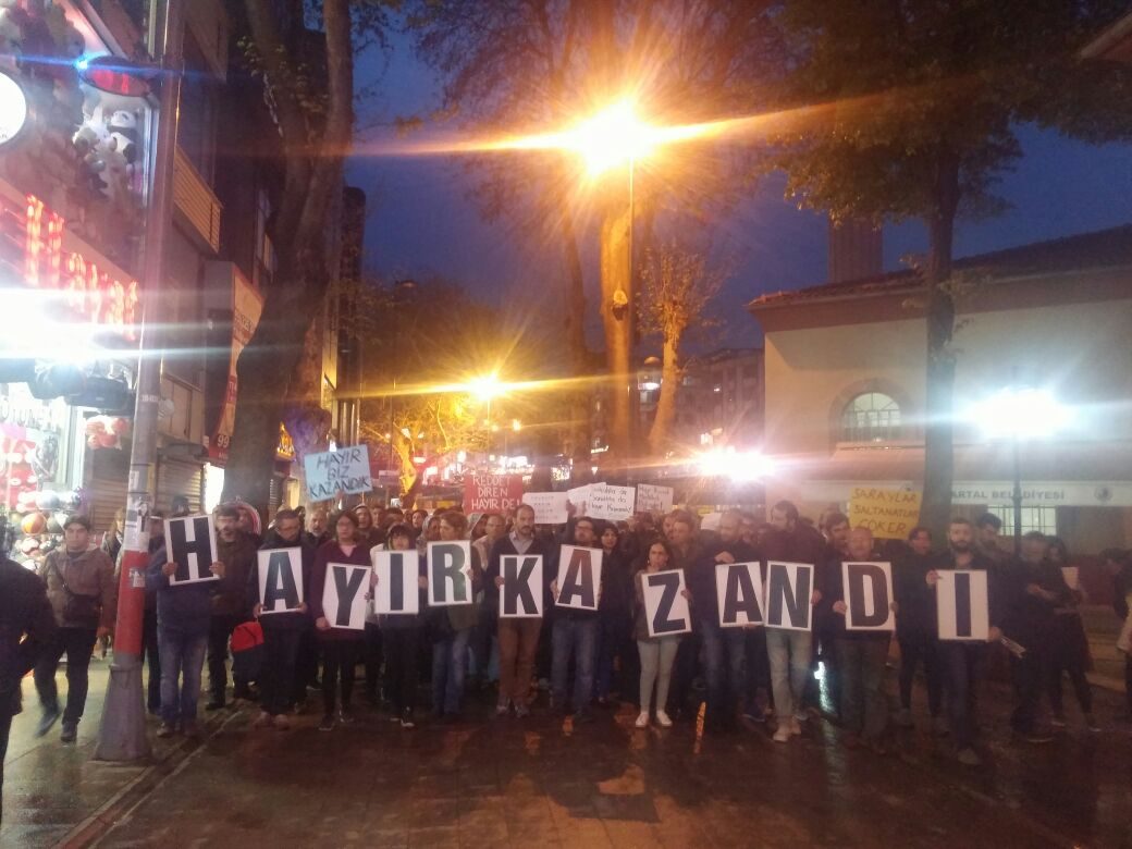 Beşiktaş Kartal Heykeli önünde bulunan vatandaşlar, seçim sonuçlarını protesto etti. Bir araya gelen yüzlerce kişi referandum sonuçlarını “Hayır kazandık”, “Tek adama hayır” ve “Bu daha başlangıç mücadeleye devam” sloganlarıyla protesto etti.