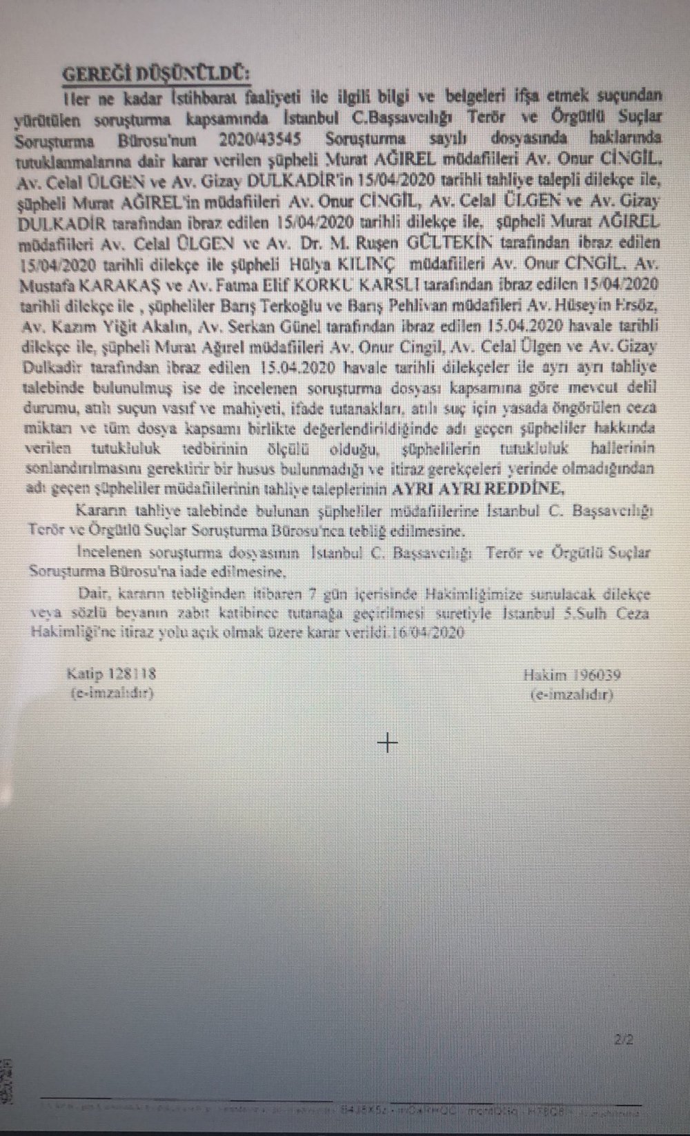 Avukat Serkan Günel, “Yeni infaz düzenlemesi uyarınca (hiç bir suçları olmamasına rağmen) ceza alsalar bile ‘yatar’ları olmayan Barış’lar için ve aynı koşullardaki diğer tutuklu gazeteciler için yapılan tahliye talebi bu hususa ilişkin hiç bir gerekçe gösterilmeden reddedildi! Tuz koktu!” diyerek red kararını paylaştı.
