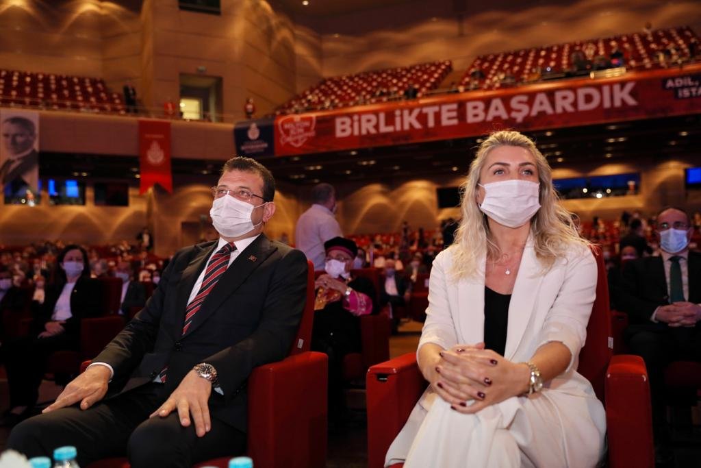 İmamoğlu salona eşi Dilek İmamoğlu ile birlikte geldi.