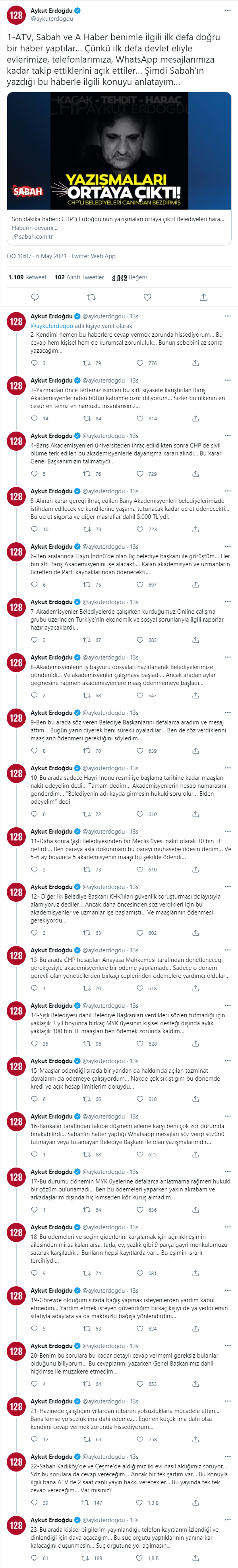 Demirören Haber Ajansı’nın (DHA) aktardığı habere göre, Ankara Cumhuriyet Başsavcılığı’ndan yapılan yazılı açıklamada, “27’nci dönem milletvekili Aykut Erdoğdu’nun 04/05/2021 tarihinde Twitter’dan yaptığı açıklamada, Cumhurbaşkanına hakaret teşkil eden sözler sarf ettiği iddiasıyla, Cumhurbaşkanı Sayın Recep Tayyip Erdoğan vekili tarafından verilen şikayet dilekçesi üzerine, Ankara Cumhuriyet Başsavcılığı’nca soruşturma başlatılmıştır” denildi.