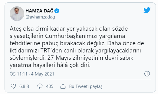 AKP Genel Başkan Yardımcısı Hamza Dağ da CHP’li Erdoğdu’ya yanıt vererek, “Ateş olsa cirmi kadar yer yakacak olan sözde siyasetçilerin Cumhurbaşkanımızı yargılama tehditlerine pabuç bırakacak değiliz” dedi.