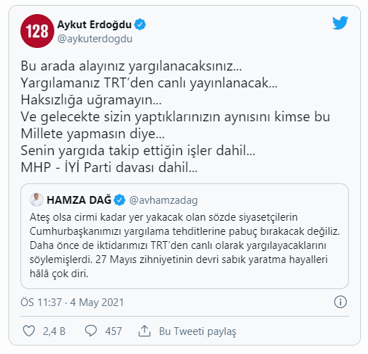 AKP’li Hamza Dağ’ın tweet’lerine de yanıt veren CHP’li Aykut Erdoğdu, “Bu arada alayınız yargılanacaksınız. Yargılamanız TRT’den canlı yayınlanacak” sözlerini sarf etti.