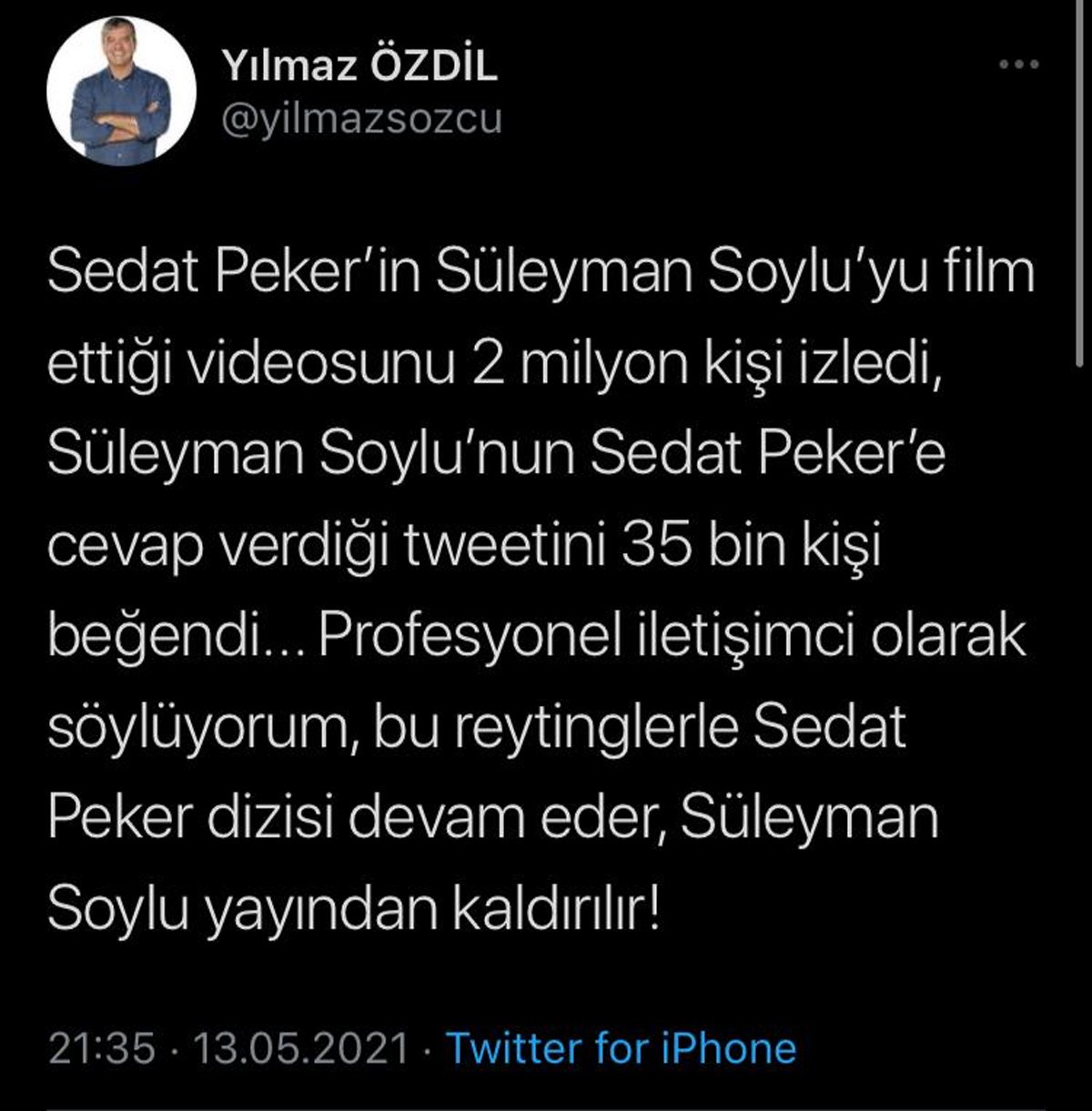 “Sedat Peker’in Süleyman Soylu’yu film ettiği videosunu 2 milyon kişi izledi, Süleyman Soylu’nun Sedat Peker’e cevap verdiği tweetini 35 bin kişi beğendi… Profesyonel iletişimci olarak söylüyorum, bu reytinglerle Sedat Peker dizisi devam eder, Süleyman Soylu yayından kaldırılır!”