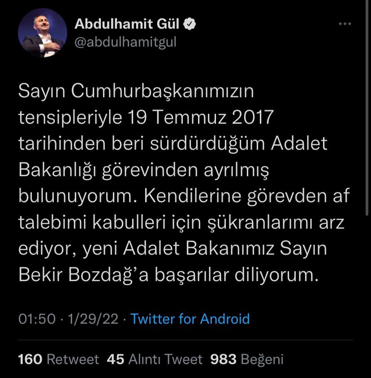 Adalet Bakanı Abdulhamit Gül görevinden istifa etti. Gül’ün yerine görevi devraldığı Bekir Bozdağ yeniden atandı. İstifa eden Gül’den ilk açıklama da gece saatlerinde geldi. Öte yandan Cumhurbaşkanlığı da istifa kararının ardından bir açıklama yaptı.