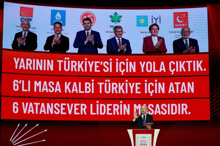 Altılı masaya değinen Kılıçdaroğlu şöyle konuştu: “6’lı masa, kalbi Türkiye için atan altı vatansever liderin masasıdır. Meral Hanım merttir. Temel Bey bilgedir ve cesurdur. Ahmet Bey ile vatan söz konusu olduğunda bir araya gelmekten bir an bile tereddüt etmedik. Ben Gültekin Bey de Menderes ve Demirel’in gençliğini, onların ruhunu görüyorum. Ali Babacan’ın uygulama tecrübesini ve başarısını biliyorum, altını çiziyorum, bütün dünya da bu gerçeği biliyor. Anayasamız, ekiplerimiz, kadrolarımız hazır.”