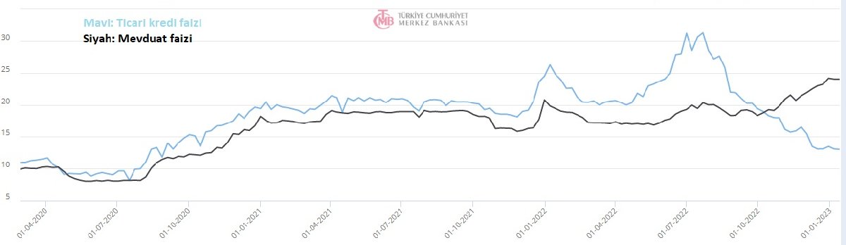 İstisna durumlar haricinde geçmişte hep ticari kredi faizlerinin altında kalan mevduat faizi, şu an ticari kredi faizinin 11 puan üzerinde bulunuyor.