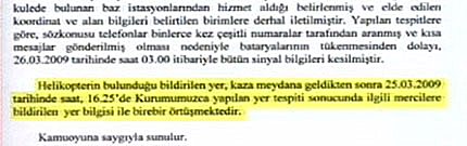 Bilgi Teknolojileri İletişim Kurumu’nun yayınladığı belgede “Helikopterin bulunduğu yer, kaza meydana geldikten sonra 25.03.2009 tarihinde saat 16.25’te kurumumuzca yapılan yer tespiti sonucunda ilgili mercilere bildirilen yer bilgisi ile birebir örtüşmektedir…” deniliyor. Tam 48 saat boyunca farklı bölgelerde aranan ve bir türlü bulunamayan enkazın yer tespitine ilişkin soru işaretleri de kalkmış oldu.