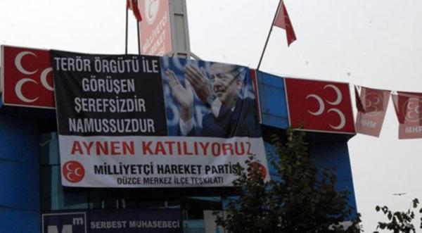 MHP Düzce il binasına Cumhurbaşkanı Recep Tayyip Erdoğan’ın fotoğrafının da bulunduğu ‘Terör örgütü ile görüşen şerefsizdir namussuzdur’ hemen altına da ‘Aynen katılıyoruz’ yazılı afişler asıldı. Düzce’de Erdoğan’ın fotoğrafının da bulunduğu ‘Terör örgütü ile görüşen şerefsizdir namussuzdur’ afiş altına da ‘Aynen katılıyoruz’ yazılı afişler asıldı.