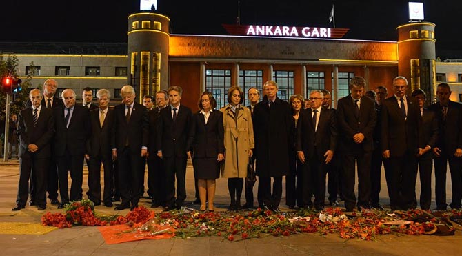 AB ülkelerinin Türkiye’de görevli 27 Büyükelçisi, Ankara Tren Garı önünde meydana gelen patlamada hayatını kaybedenlerin anısına olay yerine 97 kırmızı karanfil bıraktı.