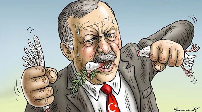 Alman medyasının ünlü karikatüristlerinden Marian Kamensky, Ankara’daki patlama sonrası Cumhurbaşkanı Erdoğan’ı barış güvercinini öldürürken resmetti.