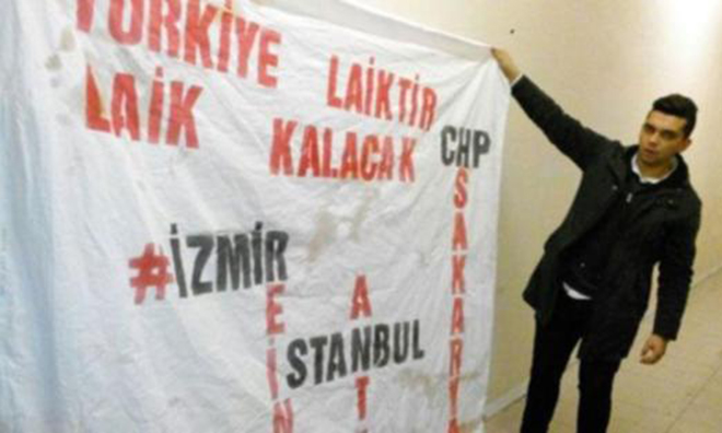 Sakarya‘da ‘Türkiye laiktir, laik kalacak‘ pankartı açan 3 CHP‘li genç önce çevredeki kişiler tarafından tartaklandı, daha sonra da polis tarafından gözaltına alındı. Sakarya’nın en büyük alışveriş merkezi olan Serdivan AVM’ye üst kattaki restoranların olduğu kata gelen CHP’li gençler “Türkiye laiktir, laik kalacak” yazılı pankart açtı. Pankartta ayrıca “Ankara, İstanbul, Antep, İzmir, Reina” ve “CHP Sakarya Gençlik Kolları” yazıları yazarken 3 genç sloganlar attı.